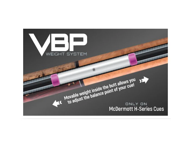 The H850 is a sharp looking cue that features a Birdseye maple forearm & sleeve with double-wash grey & natural walnut stain. The wrap is different than any other McDermott, they've used a black painted no-wrap handle. The H850 comes standard with the i-2 performance shaft. The struggle to get a perfectly balanced cue is officially over. McDermott's new H-Series cues addresses this problem with the first ever cue to features the fully-adjustable Variable Balance Point (VBP) weight system. This system features a full-length carbon fiber core with a rail on which the weights can be re-positioned forward or backward.