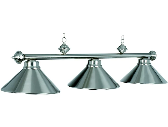 These all-metallic pool table lights offer excellent value. They are available in four different colors and finishes, Stainless, Polished Brass, Antique Brass and Matte Black with Stainless accents. This light is also available in a 4-lamp version